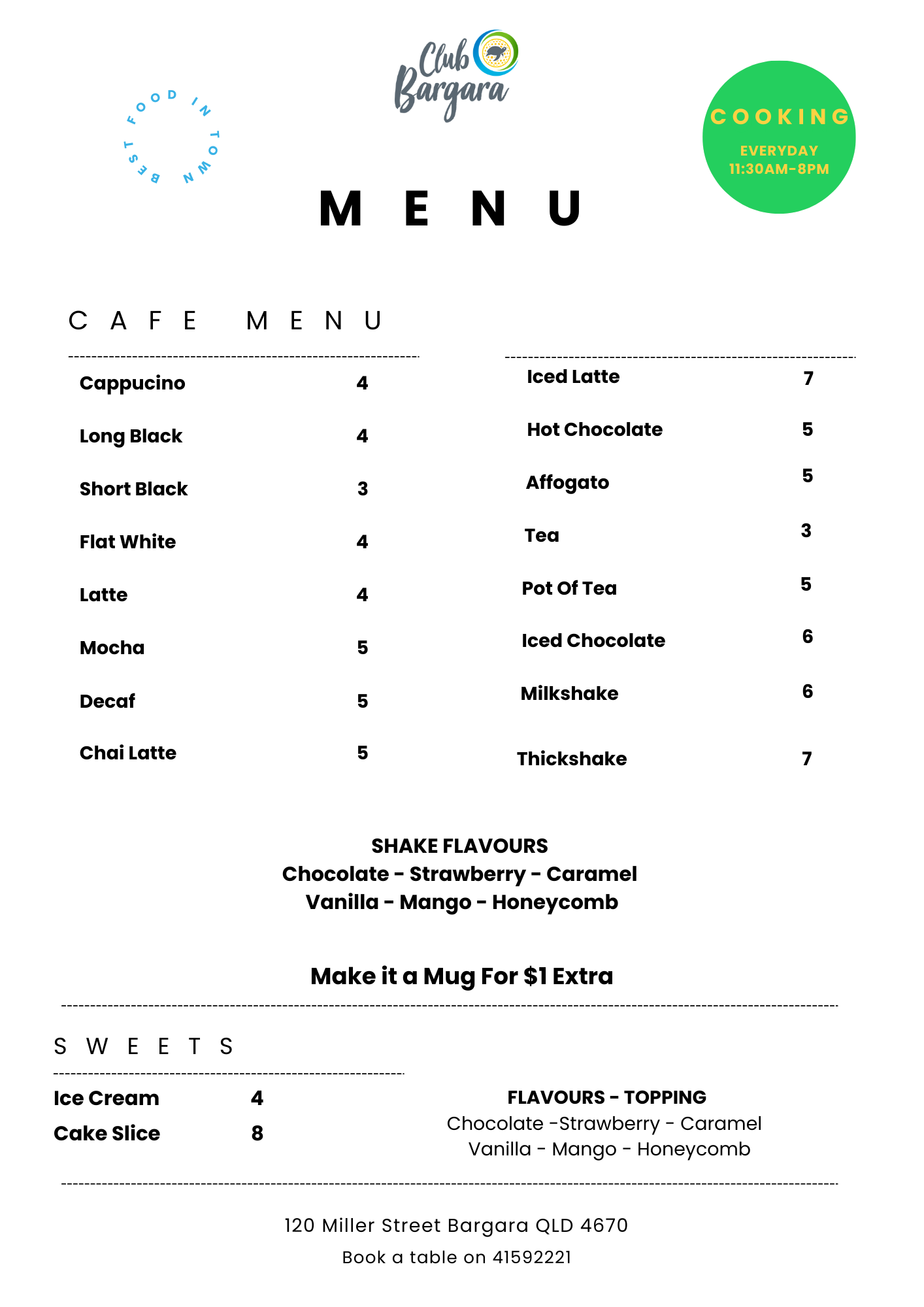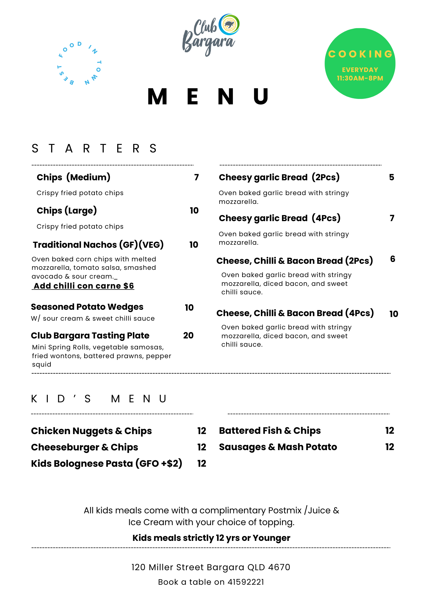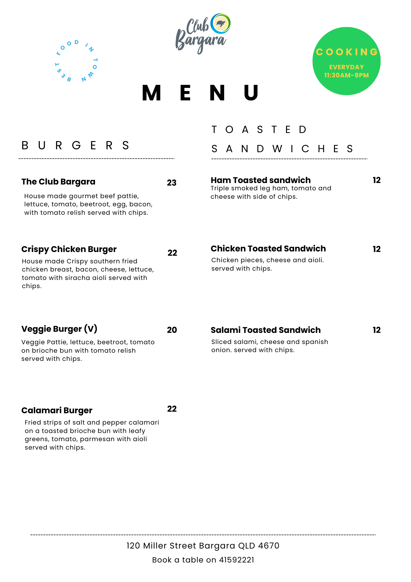 Club Bargara Bistro *** Bistro Open 7 Days A Week *** From 11.30am til 8pm Bistro Menu Meet Our Bistro Staff Contact Us To give feedback or to make an enquiry about our Golf Club please click on the Contact Us button below. Contact Us