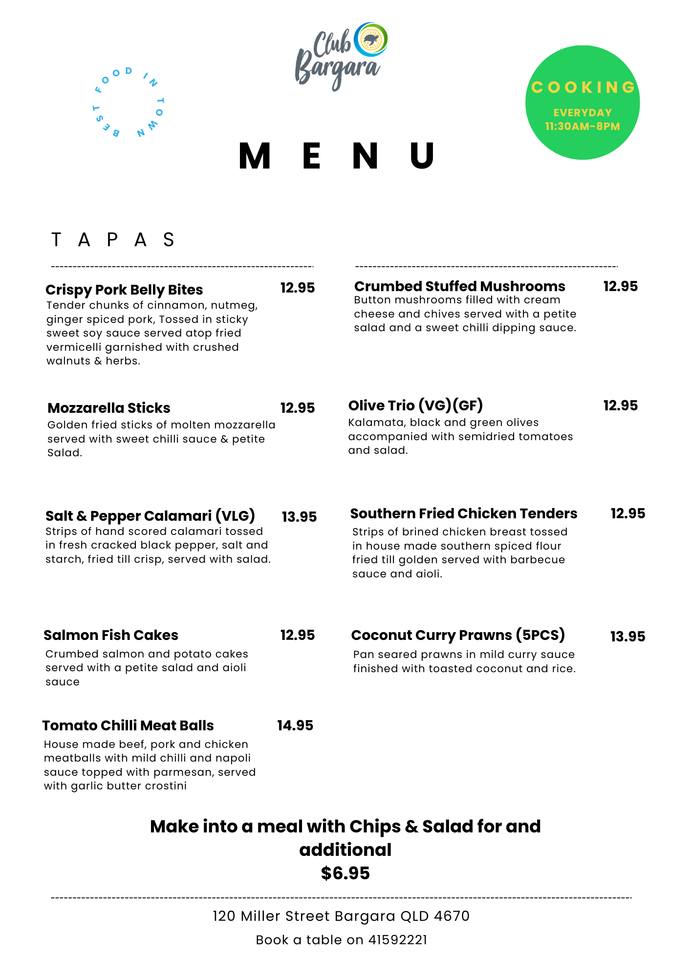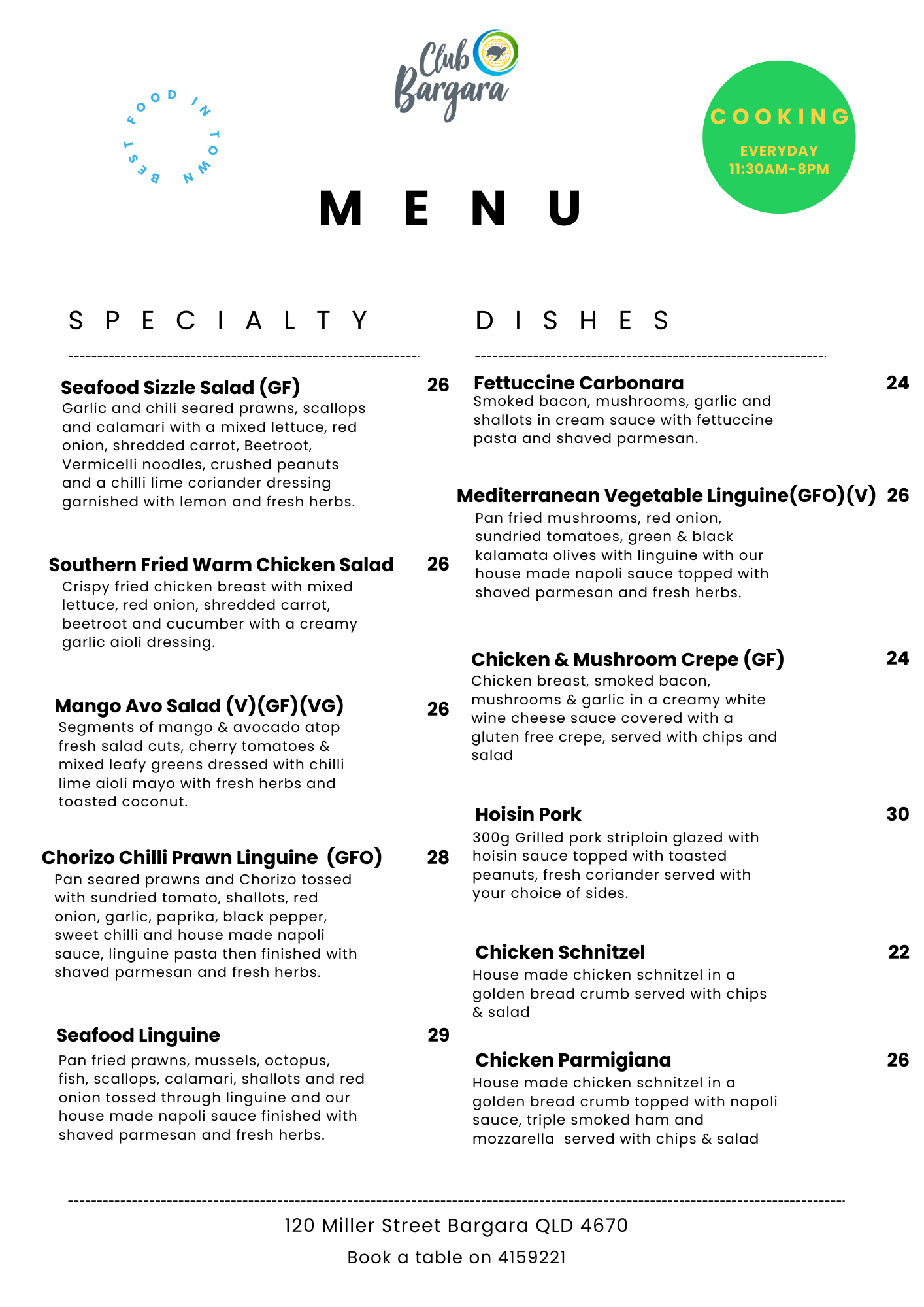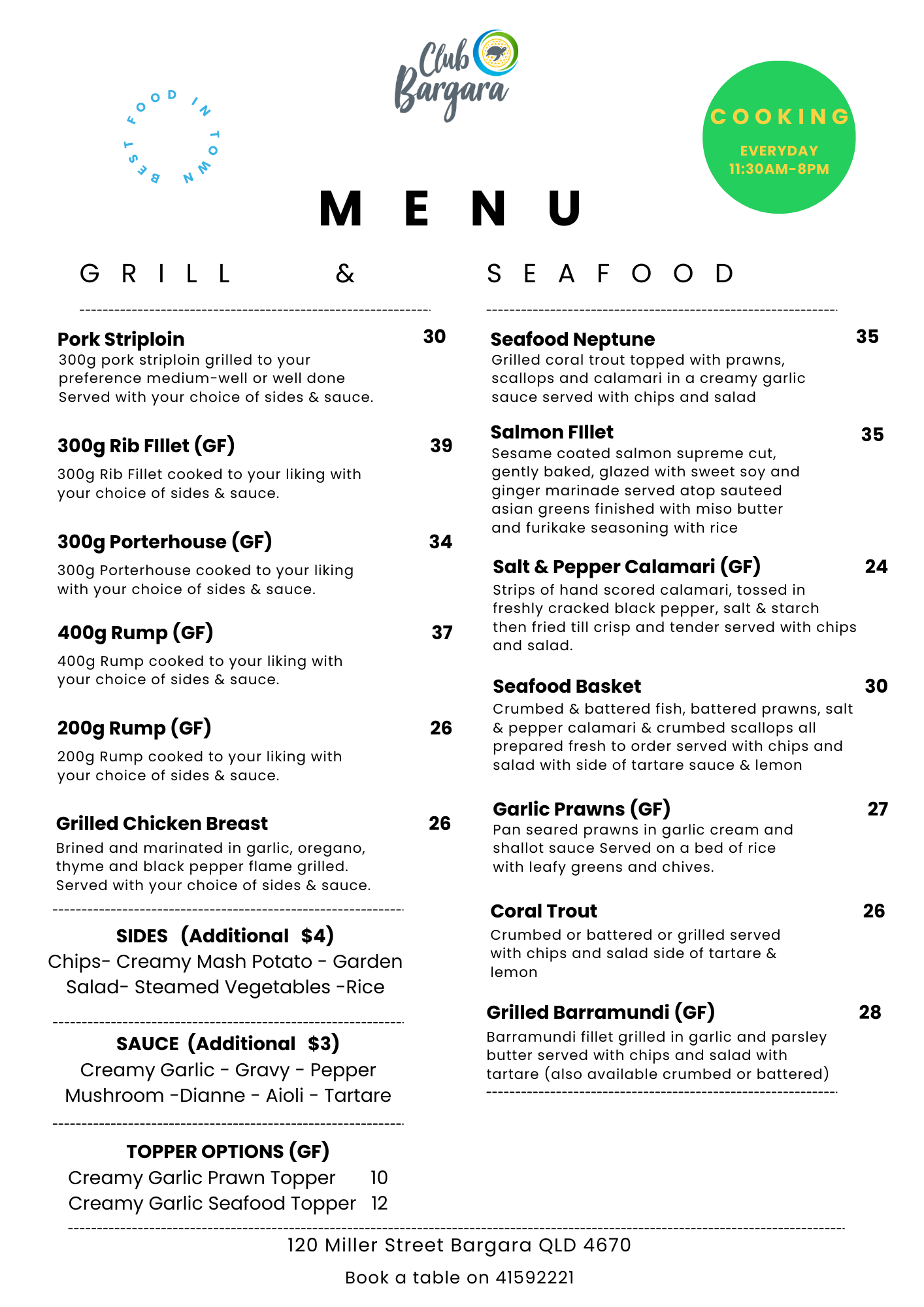 Club Bargara Bistro *** Bistro Open 7 Days A Week *** From 11.30am til 8pm Bistro Menu Meet Our Bistro Staff Contact Us To give feedback or to make an enquiry about our Golf Club please click on the Contact Us button below. Contact Us
